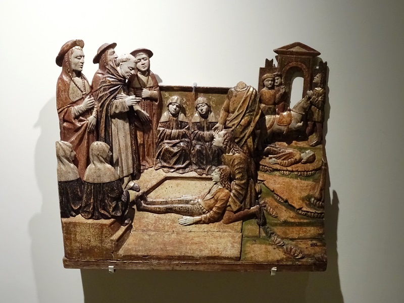 After inspecting the collection of arms and armour, I continued towards the Pinacoteca. On display here are not just paintings, but also wooden sculptures. A good example of the latter is a sculpture showing The Miracle of Saint Dominic, carved out of wood and then painted and gilded. The saint manages to resurrect a boy, Napoleone Orsini, who has been trampled by a horse. The miracle can be seen on the left, the accident with the horse on the right. The work is attributed to the Fratelli De Donati and can be dated to 1495-1500.