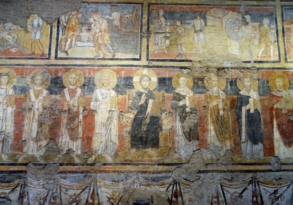 The largest fresco cycle in the church can be found in the left aisle, and we are fortunate that substantial parts of it have survived. The frescoes were commissioned by Pope Paulus I (757-767). They are divided into four registers, the top two registers showing scenes from the lives of Noah, Jacob and Joseph. The lowest register is made up of painted curtains or vela. The largest and most interesting register is actually the one right above the vela. It shows Jesus Christ enthroned in the centre, flanked by almost two dozen saints from the East and the West (there are 22 saints in total, 9 on the left, 13 on the right). All of the saints were once labelled. Most labels have survived, and these are all in Greek again, even the names of the Western saints.