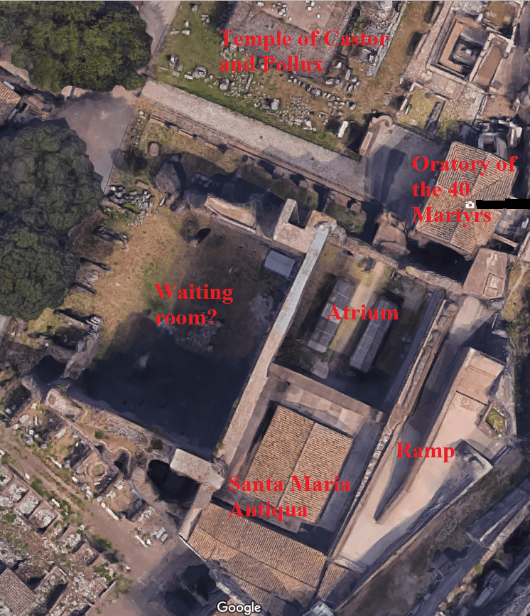 More archaeological research is needed to fully clarify the functions of all the buildings close to the bottom end of Domitianus’ ramp. And even if more evidence becomes available, it may not be sufficient to answer all of our questions. Nevertheless, it should be possible to make a reasonably plausible reconstruction of this part of the Forum. The image included in this post, taken from Google Earth, might be helpful.